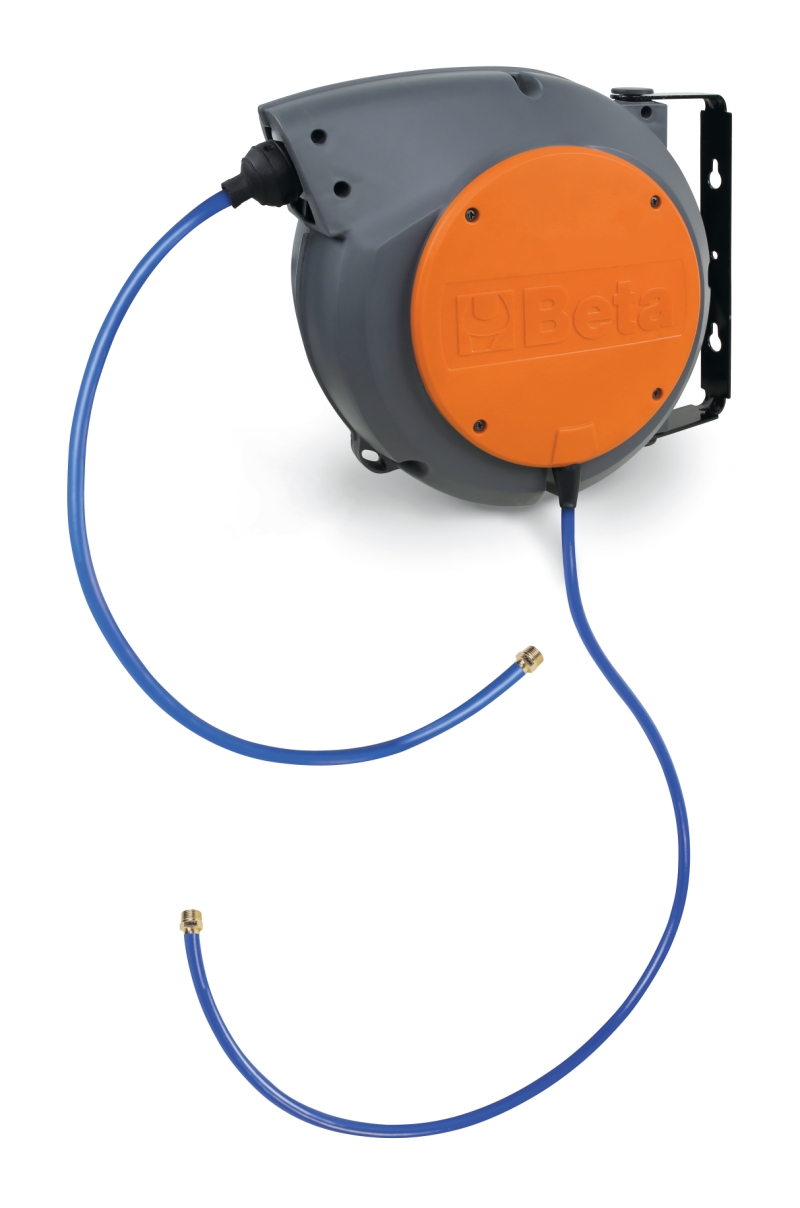 automatikus rugós tömlődob ütésálló műanyag test, levegőhöz és vízhez 1900S max. üzemi nyomás: 15 bar fonott poliuretán tömlő polipropilén váz a tömlőt a kívánt hosszban rögzítő szerkezet a reteszelő mechanizmus kikapcsolható, így a tömlő folymatos visszahúzását teszi lehetővé üzemi hőmérséklet tartomány víz esetén: -5 °C / +50 °C 180°-os elforgatható konzollal és kiegészítő gyorscsatlakozó konzollal szállítva